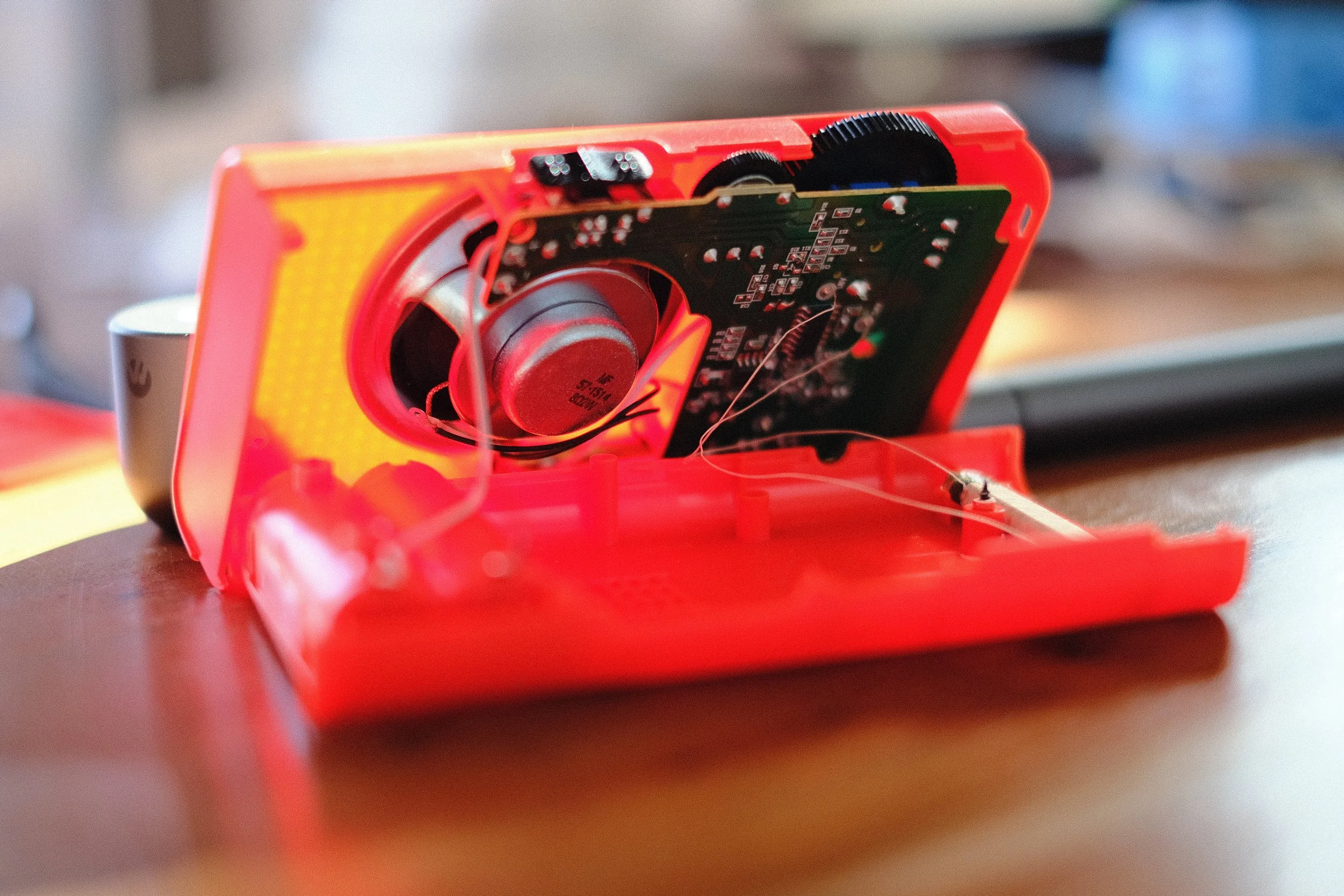 This assembly process varied across the multiple radios, some had the board and dial attached to the same enclosure side as the indicator window. I imagine having them both on the same side of the enclosure makes assembly easier.
